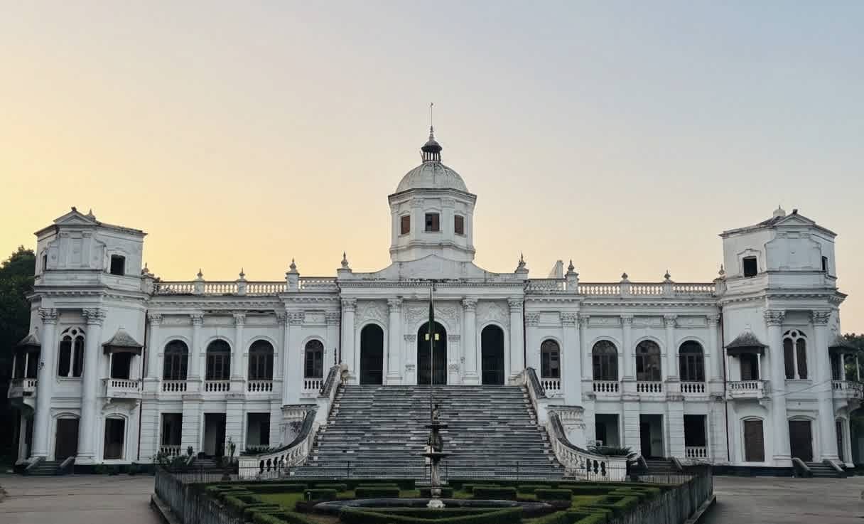 The Story Built in the early 20th century by Maharaja Kumar Gopal Lal Roy, a wealthy descendant of a prominent jeweler, this magnificent estate is a crown jewel of northern Bangladesh. Legend has it that the area itself derived its name, "Tajhat," from the glittering "Taj" (crowns) and jewels historically sold in the local bazaar. Over the decades, this grand palace has witnessed incredible transitions, even serving as a regional branch of the Bangladesh Supreme Court in the 1980s before being beautifully preserved as the Rangpur Museum. The Architecture A striking example of Indo-Saracenic and European classical architecture, the palace boasts a brilliant white facade crowned with a massive, ribbed conical dome. Approaching the elegant U-shaped mansion, you are immediately greeted by an imposing, sweeping staircase carved entirely from imported white marble. Today, the interior museum houses a fascinating collection of rare 10th and 11th-century terracotta artifacts, ancient Sanskrit manuscripts, and intricate black-stone carvings.
